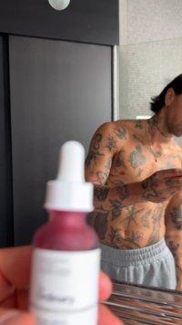 • Tatoveret, skjorteløs mand med mørkt hår påfører rød creme på sin kind i et badeværelse med flisevæg og hylde med toiletartikler.