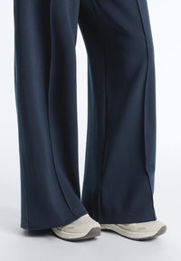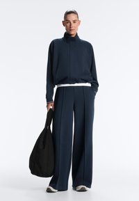 Marineblå bukser med vide ben og forreste folder, båret med hvide sneakers og en hvid skjorte stukket ind, vist fra talje til fødder.