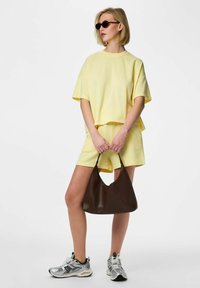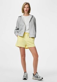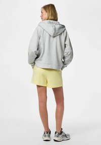 Person iført gule shorts med snøre, grå hættetrøje med lynlås, hvid t-shirt og sølvfarvede løbesko, stående med hænderne i lommerne.