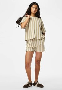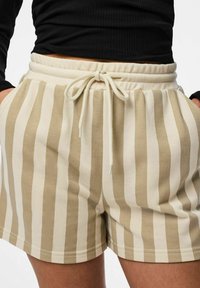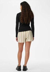 Beige og hvide stribede shorts i blødt stof med en afslappet pasform, der har sidelommer og elastisk talje. Kombineret med sorte sneakers.