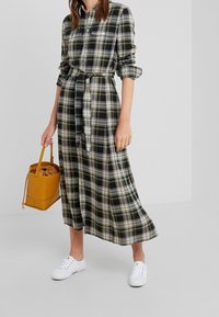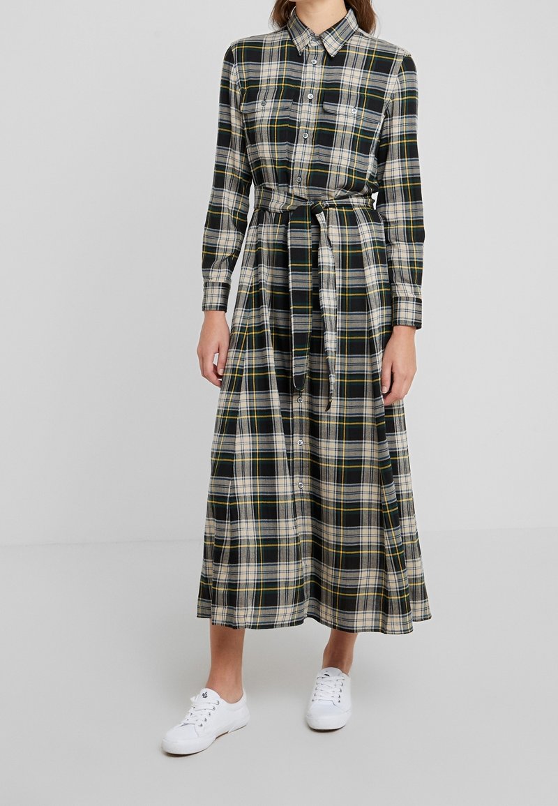 Langærmet kjole i ternet mønster med sort, hvidt og gult, med knapper, bindebånd i taljen og to brystlommer; kombineret med hvide sneakers.