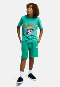 Grønblå bomulds-T-shirt med grafisk print af en kranium iført solbriller; kombineret med grønblå shorts. Sorte sko og hvide sokker fuldender looket.