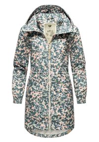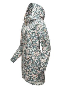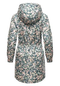 Vandtæt lang jakke med hætte, fuld frontlynlås, elastiske manchetter og pink, grøn og grå pixeleret camouflage mønster.