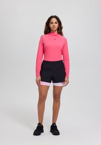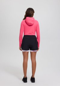 Rukka 2-i-1-shorts til damer. Nøglelomme med lynlås i siden. Elastisk linning med snørebånd. Normal linninghøjde. Laserskårne ventilationshuller. Indershorts. Trykt mønster. 4-vejs stretchmateriale strækker sig i alle retninger og sikrer fuld bevægelsesfrihed. Stoffet lader fugt fordampe hurtigt, hvilket sikrer en tør og komfortabel bærekomfort.