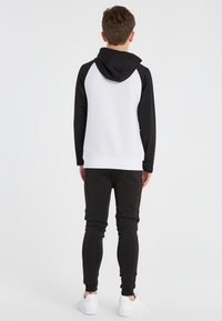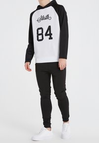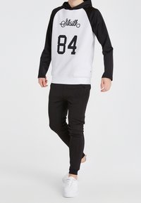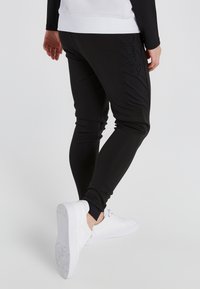 Sorte atletiske joggers med en tætsiddende design, der har et tekstureret stof og et broderet logo på låret, parret med hvide sneakers.