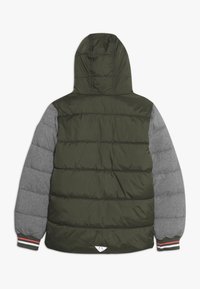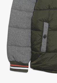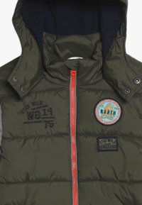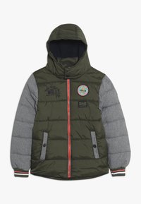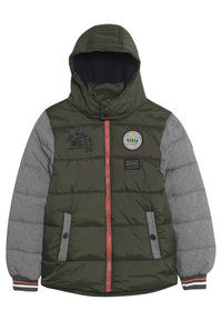 Polstret jakke i mørkegrøn med grå ærmer, hætte, frontlynlås og orange detaljer. Har broderede lapper og sidelommer.
