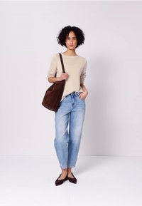 Kvinde med krøllet hår iført beige strikket sweater og blå jeans, der holder en foldet brun ruskindsjakke i den ene hånd og har den anden hånd i lommen.
