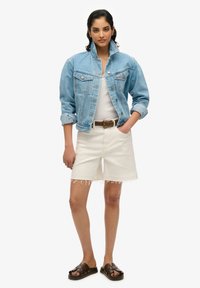 Lysblå denimjakke med klaplommer, sølvdetaljer og høj krave. Båret over en hvid tanktop og parret med hvide shorts.