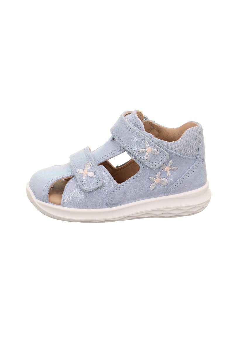 Svetblå åbne sandaler lavet af ruskind, med to justerbare velcro-remme og broderede blomstermotiver på siderne.