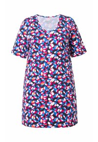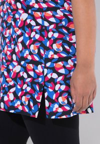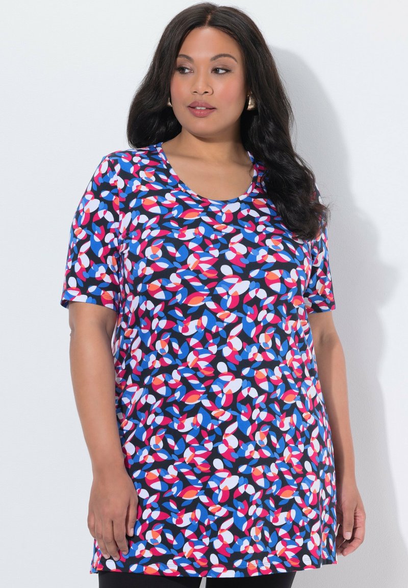 Kvinde med langt mørkt hår iført kortærmet tunika med flerfarvet abstrakt mønster mod en ensartet lys baggrund.