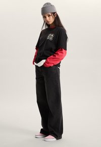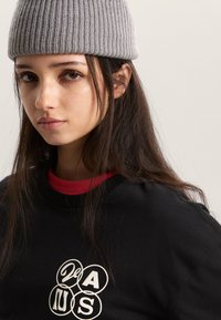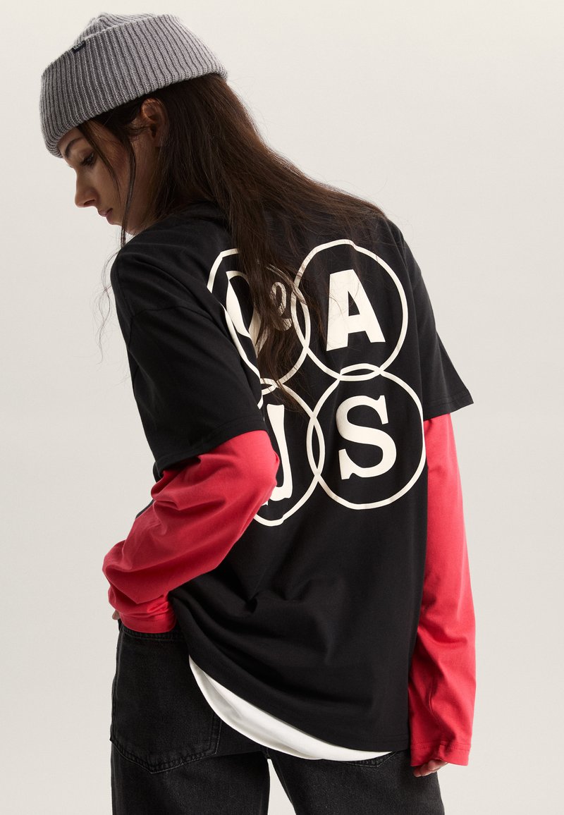 Sort t-shirt med hvidt grafisk design, der har teksten "PAUS" og cirkler. Lange røde ærmer under. Strikket grå hue på hovedet.
