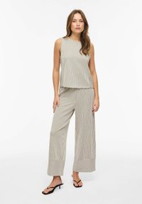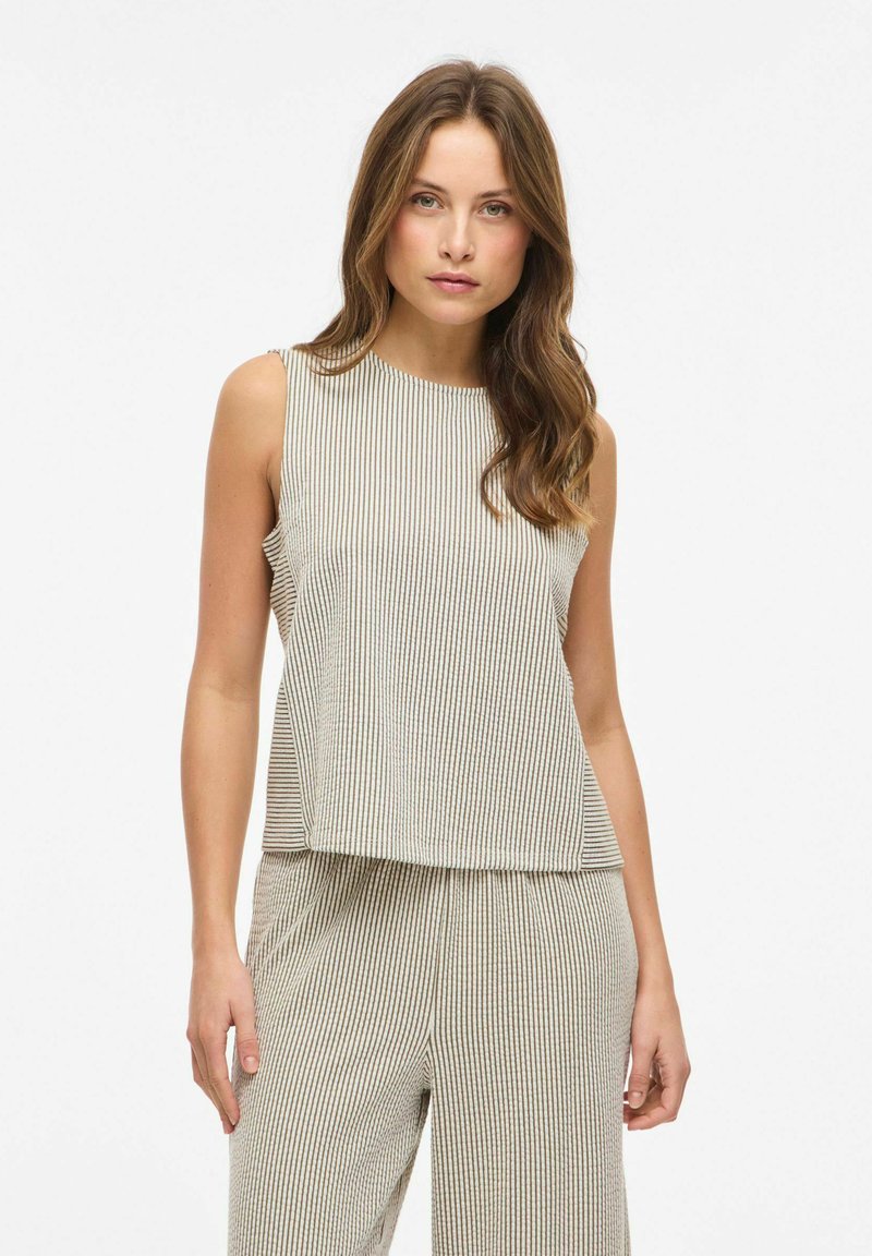 Kvinde med lyst brunt hår iført ærmeløs beige og hvidt top med lodrette striber og matchende bukser, stående mod en ensfarvet hvid baggrund.