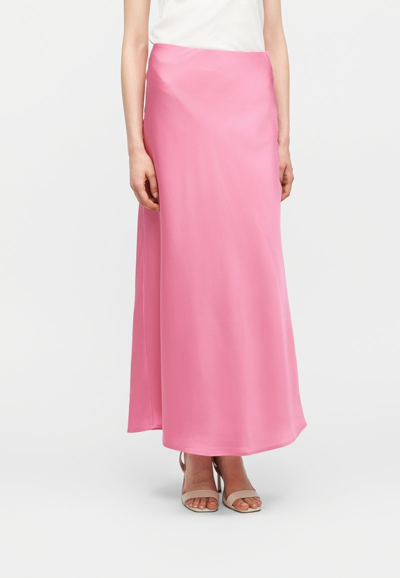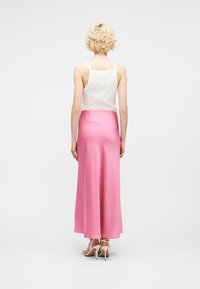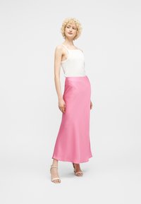 Kvinde iført en hvid top og et langt lyserødt satin nederdel med beige åbne tå-sko, stående mod en ensfarvet hvid baggrund.